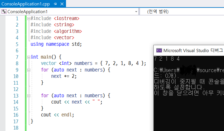 (위에 짤린 부분은 for (auto it = numbers.begin(); it != numbers.end(); it++) 입니다. )
