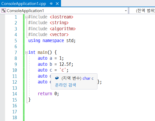 위처럼 커서를 올려보면 auto가 감지한 변수 타입이 나옵니다.