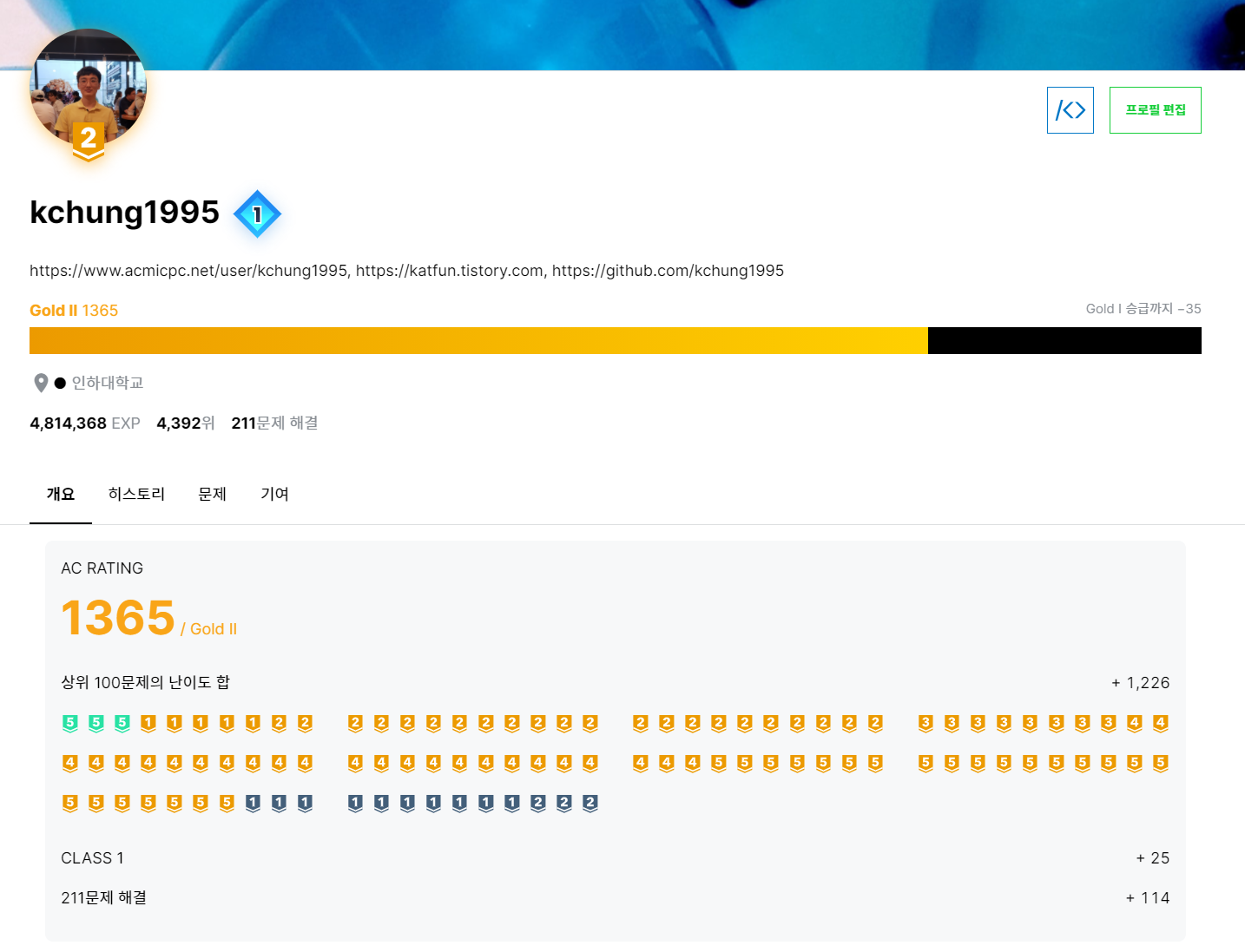 제 링크 (https://solved.ac/profile/kchung1995)를 보시면, 골드 2 등급이고, 지금까지 풀었던 문제들의 카테고리, 종류 등을 볼 수 있습니다.