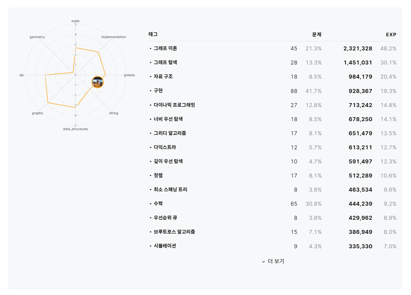 위 사진처럼 내가 현재 어느 정도 위치에 있는지, 어느 난이도의 문제들을 얼마나 풀었는지 볼 수 있을 뿐만 아니라,