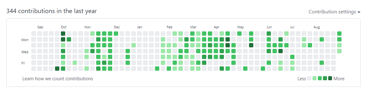 위는 GitHub의 개인 프로필 화면에서 볼 수 있는 GitHub 활동 내역입니다. 이른바 '잔디를 심는다' 라고 하죠.