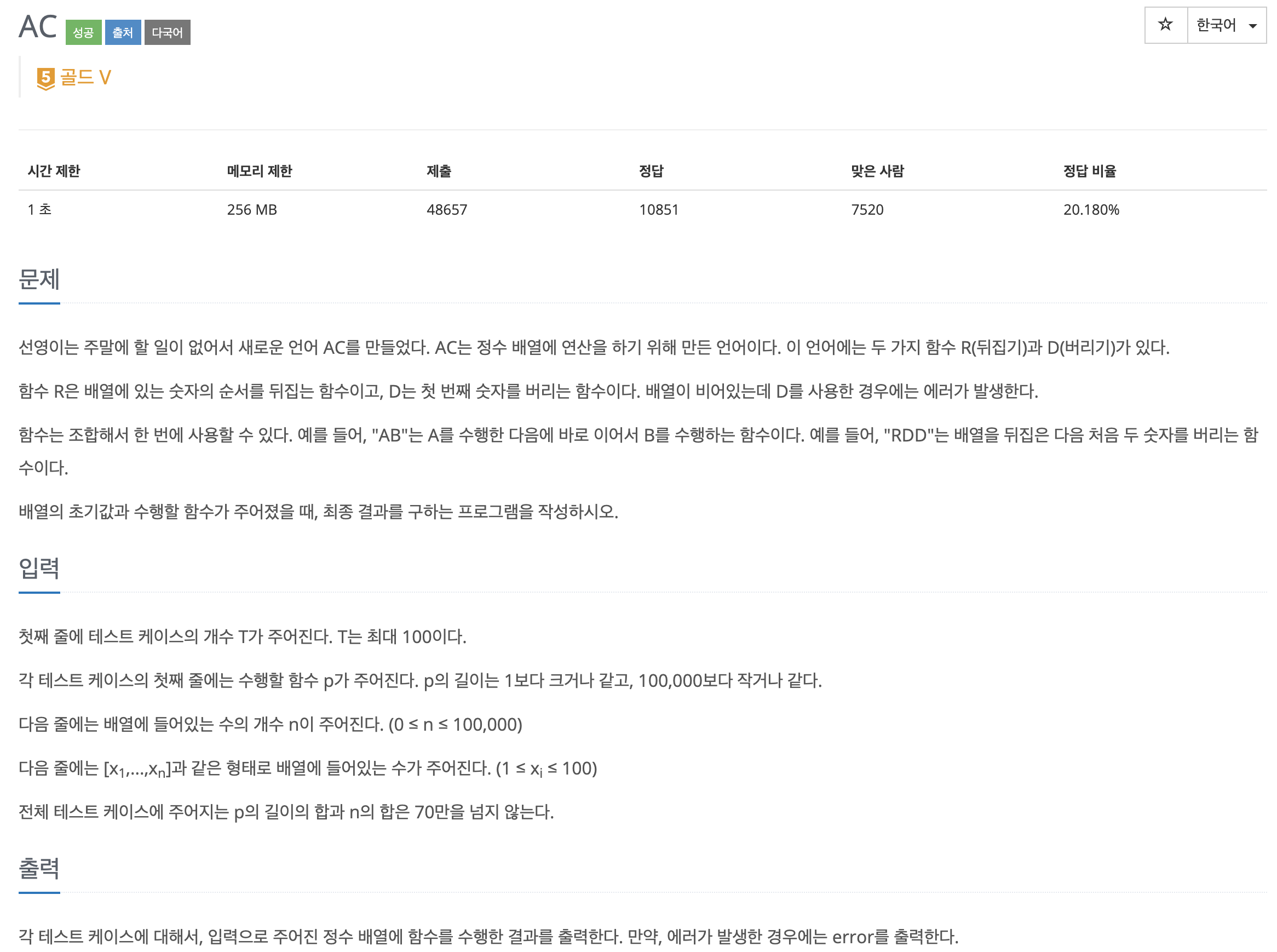 D연산이 나오기까지의 R의 총 등장 횟수가 홀수라면, 뒤집지 않았을 때 기준으로 맨 뒤의 원소를 제거하고, 짝수라면 뒤집지 않았을 때 기준으로 맨 앞의 원소를 제거합니다.
