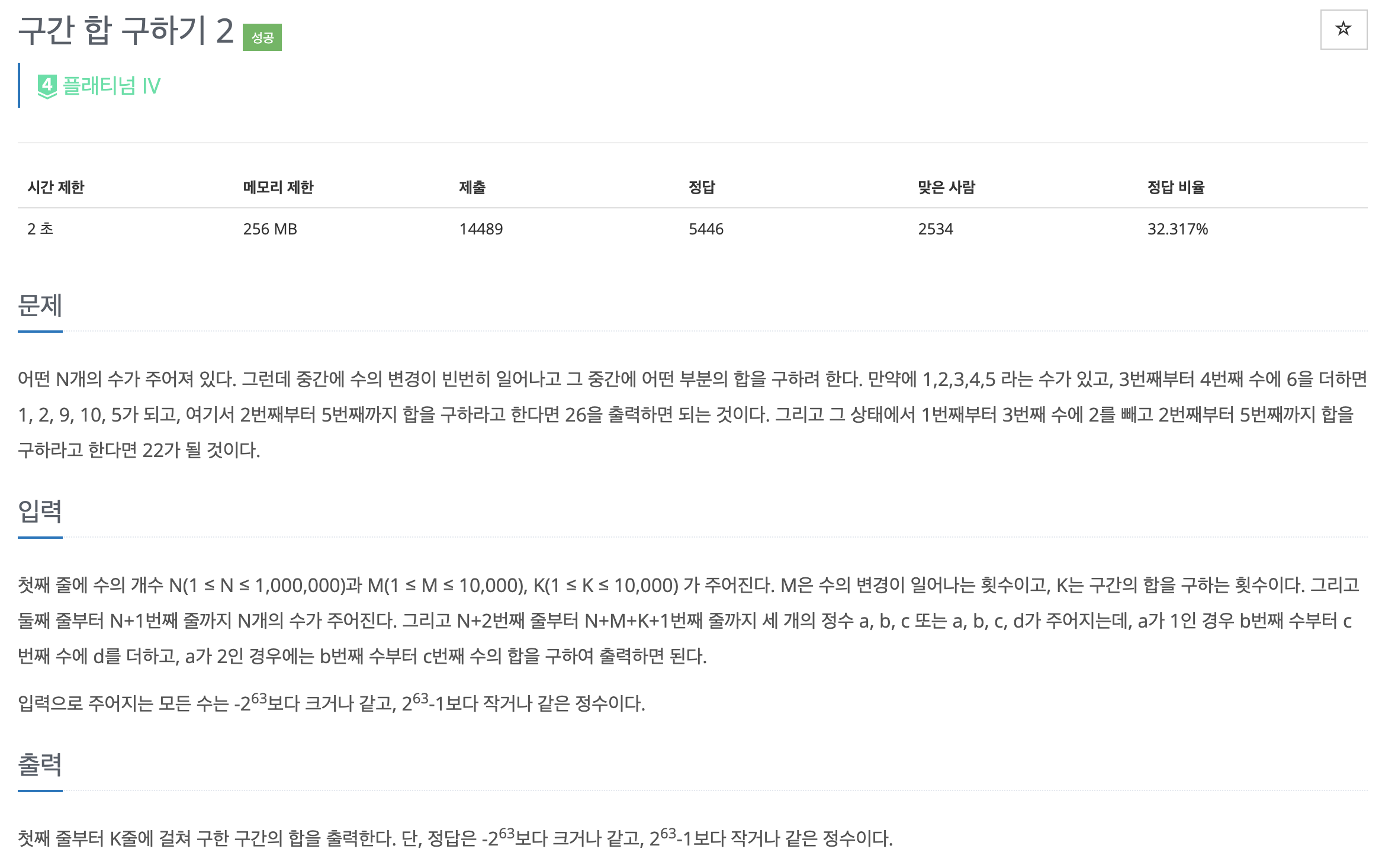 첫째 줄에 수의 개수 N(1 ≤ N ≤ 1,000,000)과 M(1 ≤ M ≤ 10,000), K(1 ≤ K ≤ 10,000) 가 주어진다. M은 수의 변경이 일어나는 횟수이고, K는 구간의 합을 구하는 횟수이다. 그리고 둘째 줄부터 N+1번째 줄