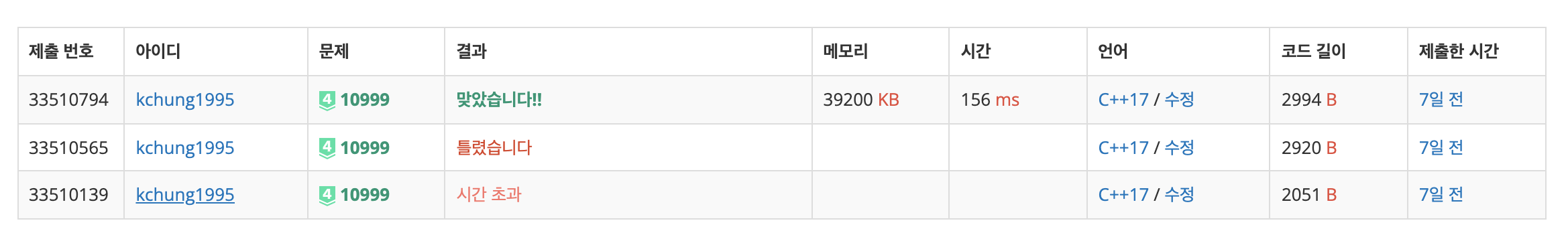 두 번째에는 부모 노드의 값을 재귀적으로 갱신하지 않아 오답 판정을 받았고, 이를 수정하니 세 번째에는 정답 판정을 받았네요.