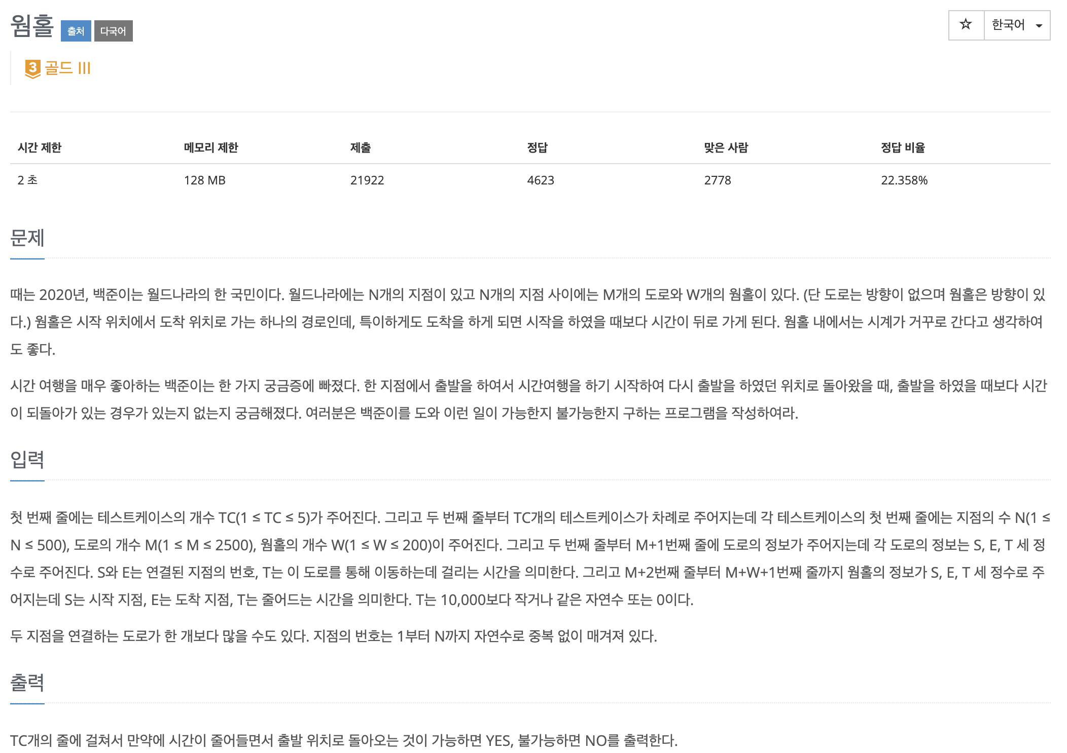 이 문제는 최단거리 문제인데, 노드와 노드 사이의 거리가 음수인 경우가 존재하는 특이한 경우입니다.