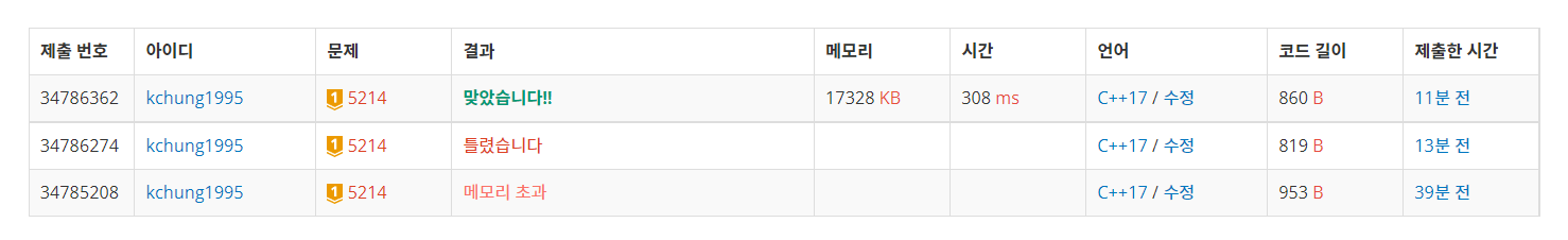 맨 처음에는 위의 메모리 초과에 걸리는 코드를 제출했고, 두 번째 제출할 때는 도달하지 못하는 경우를 고려하지 않았습니다.
