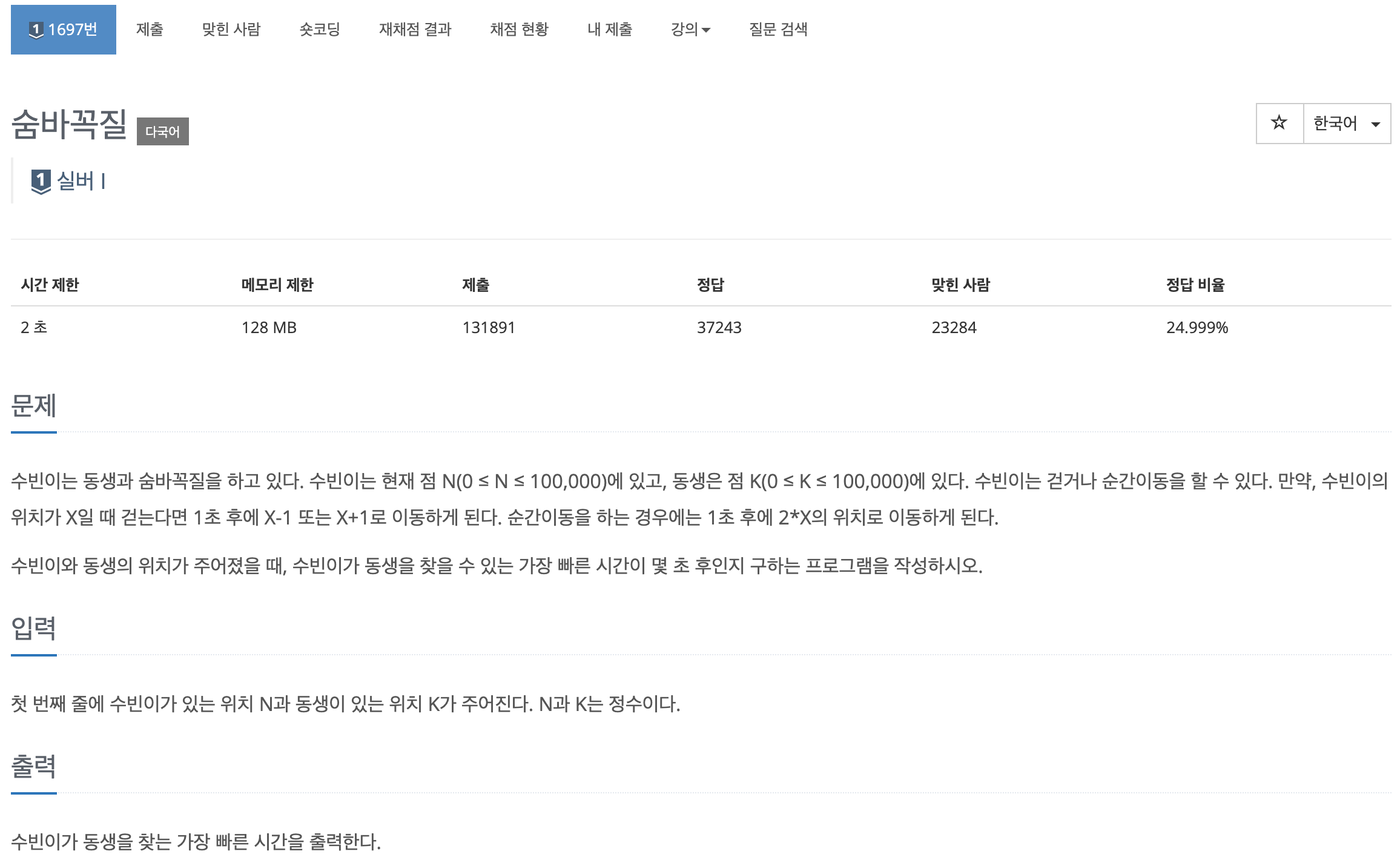 수빈이는 동생과 숨바꼭질을 하고 있다. 수빈이는 현재 점 N(0 ≤ N ≤ 100,000)에 있고, 동생은 점 K(0 ≤ K ≤ 100,000)에 있다. 수빈이는 걷거나 순간이동을 할 수 있다. 만약, 수빈이의 위치가 X일