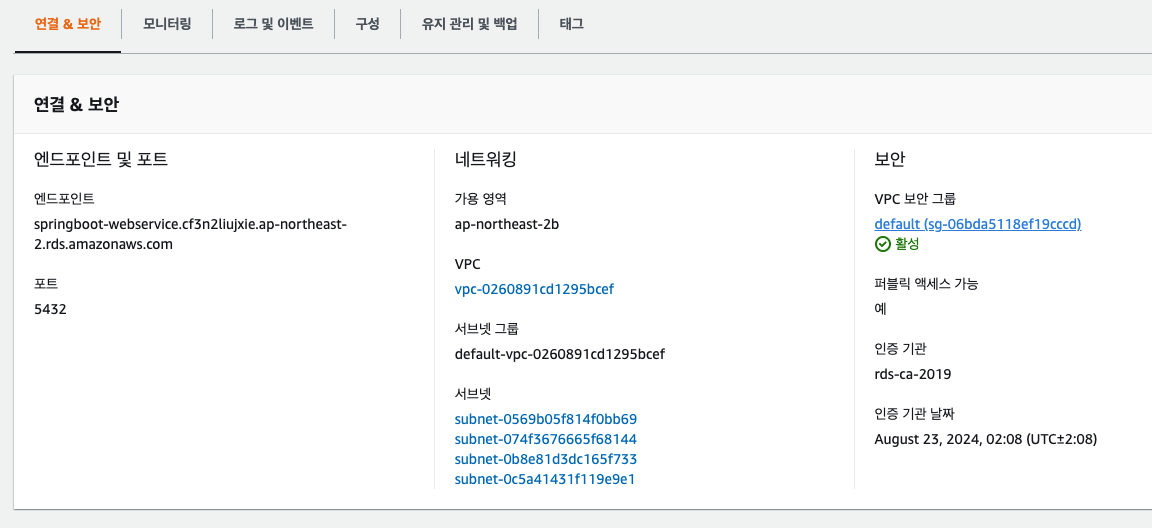완료 버튼을 누르면 위처럼 정보를 확인할 수 있다. DB가 생성되는 데에는 몇 분 정도 걸린다.