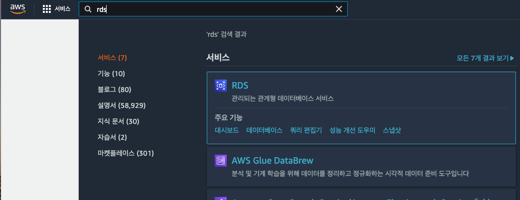 먼저 RDS 인스턴스를 생성하자. AWS 콘솔에 로그인 한 후, 검색창에 rds를 입력하고, RDS 대시보드에서 '데이터베이스 생성' 버튼을 누르면 된다.