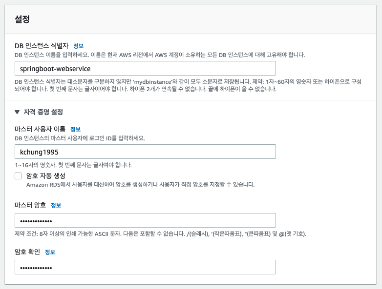 DB 인스턴스 식별자와 사용자 이름, 비밀번호를 정해 주면 된다. 여기서 설정된 사용저 정보를 이용해 실제 DB에 접근하게 된다.