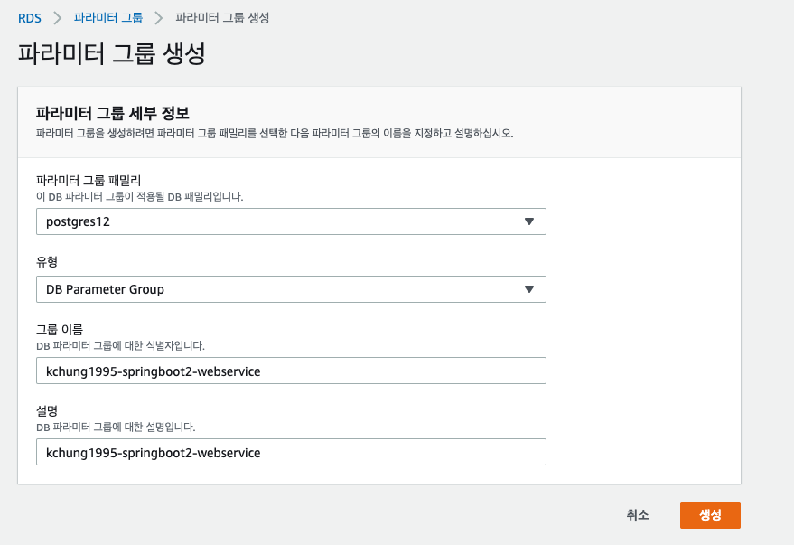 '파라미터 그룹 패밀리'에서 앞서 설정한 DB의 버전을 맞춰 주어야 한다.