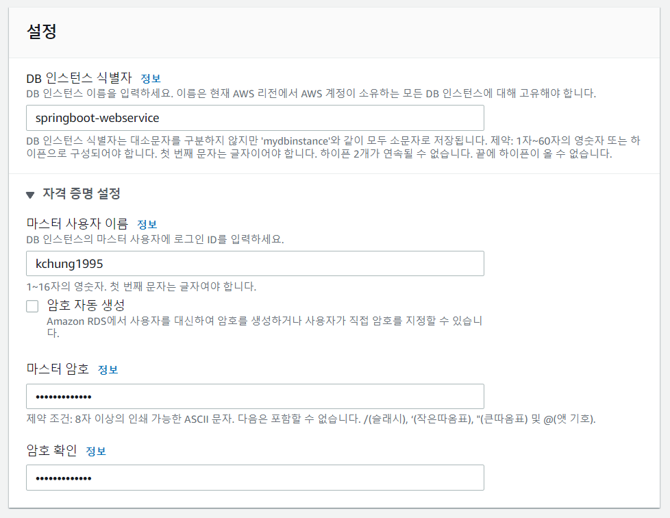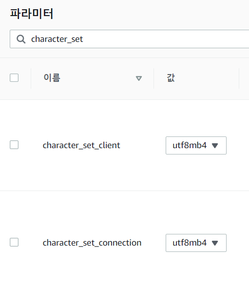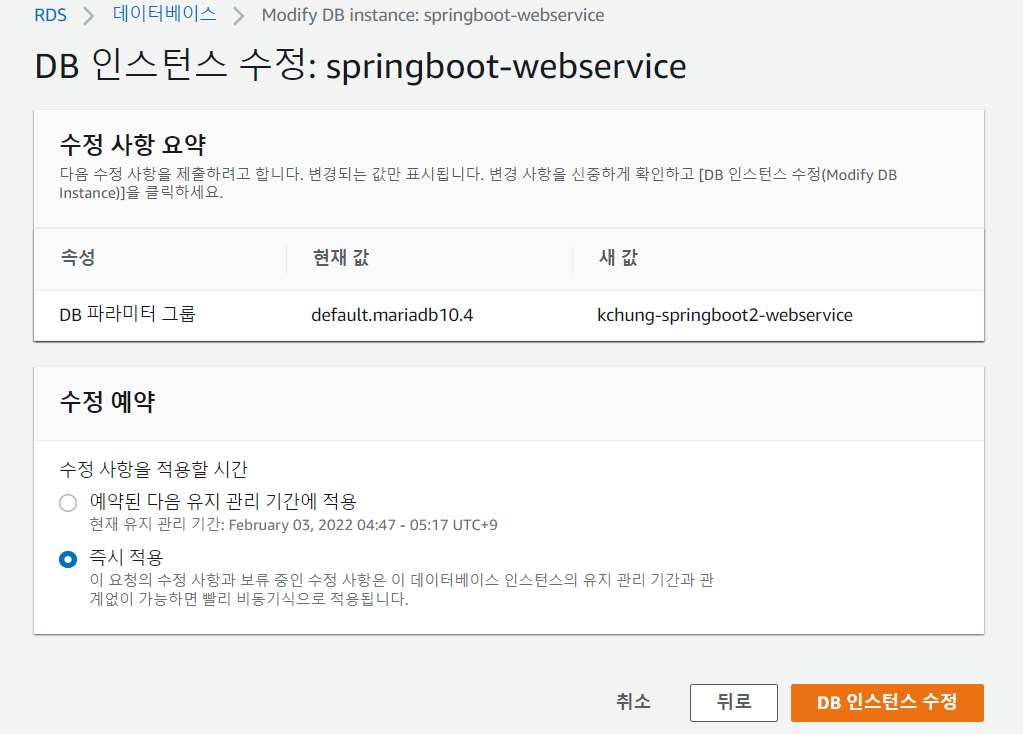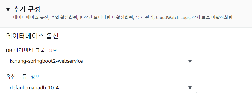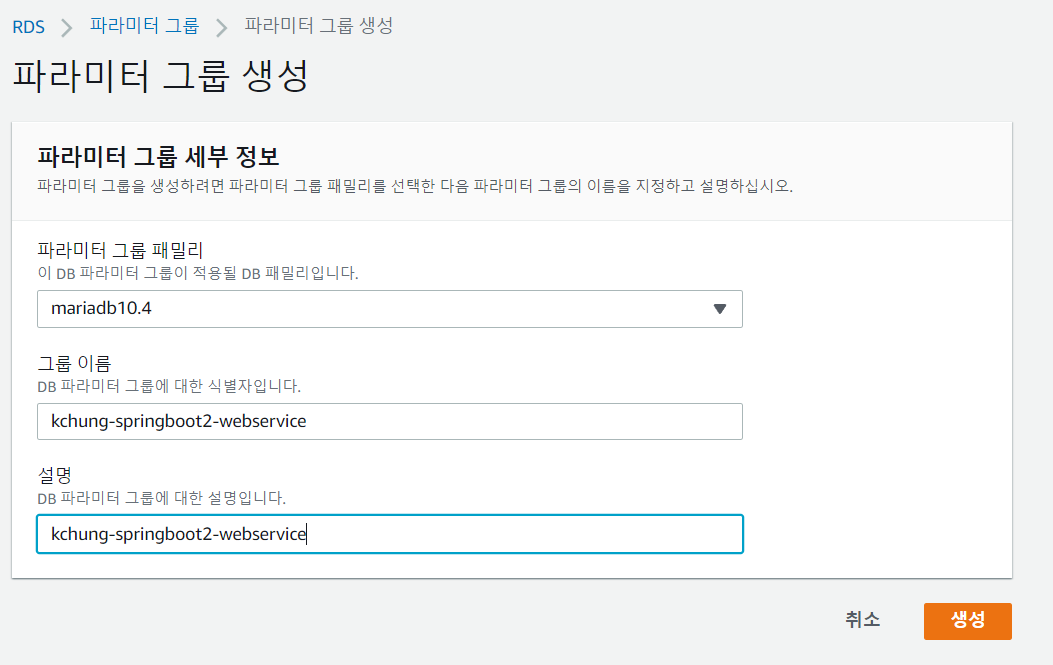 MariaDB를 위한 파라미터 그룹 'kchung-springboot2-webservice'를 생성하고, 관련된 파라미터 편집을 해 주었다.