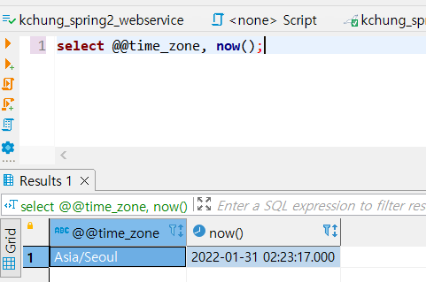 각각 DB 서버의 현재 시간/타임존 조회, 한글 저장/출력이 잘 되는지 확인을 위한 쿼리이다.