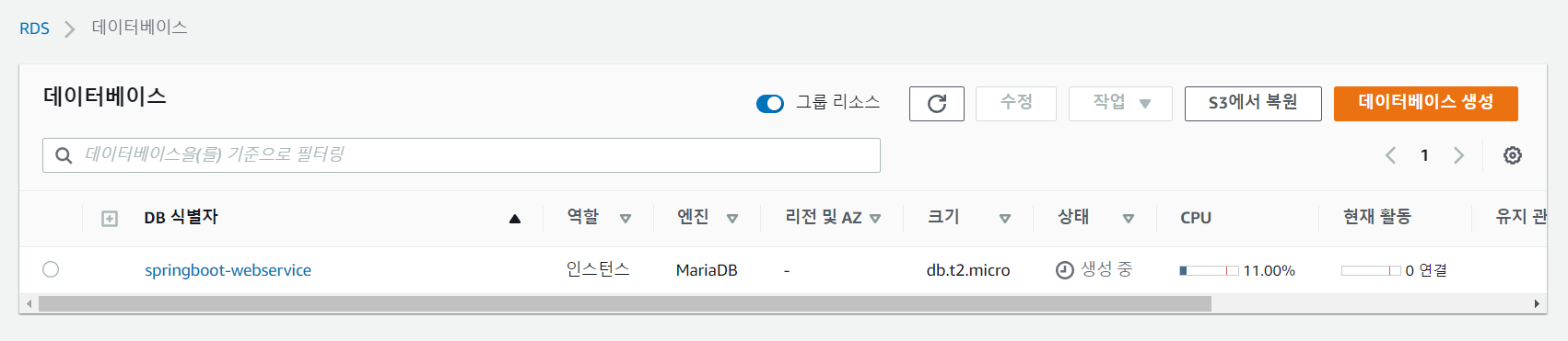 AWS RDS 대시보드에서 재부팅을 해 주었더니 잘 된다.