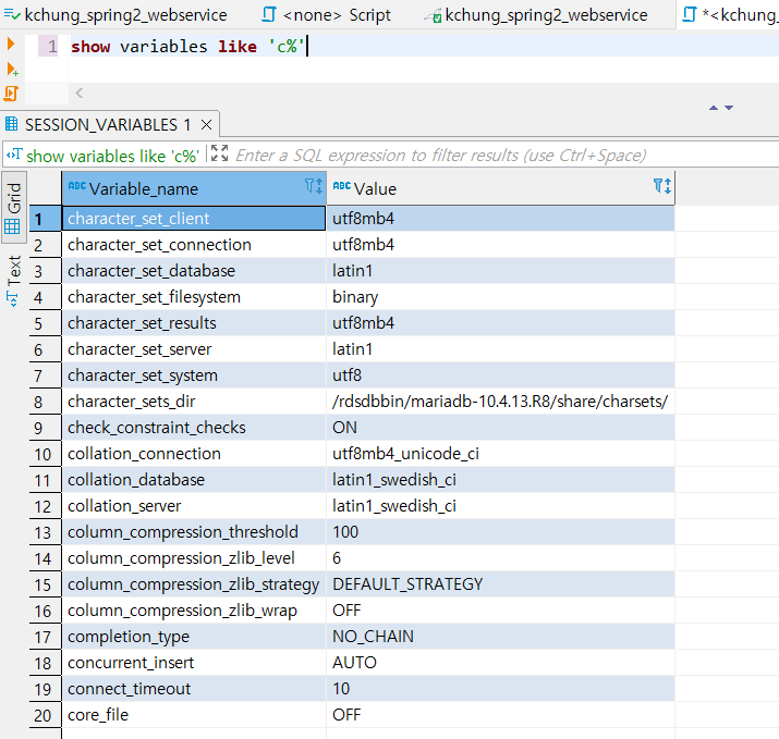그럼에도 아직 character_set_database, collation_database 두 가지는 latin으로 되어 있다.