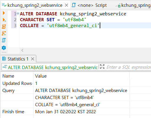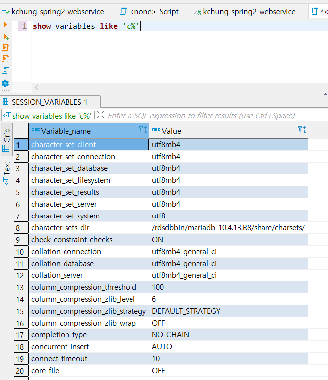 AWS 상에서는 잘 반영이 되었는데, 여기서는 아직 utf8mb4로 반영이 덜 된 모습이다.