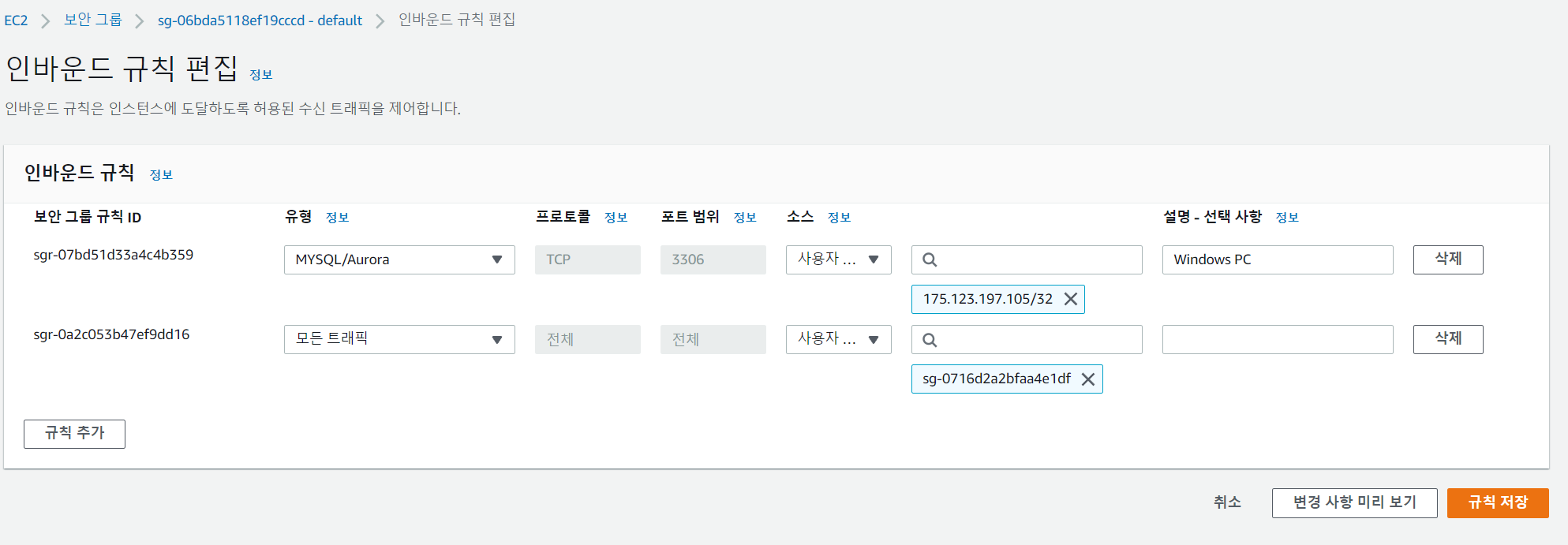인바운드 규칙 편집에 EC2와 현재 PC의 정보를 각각 입력하였다.