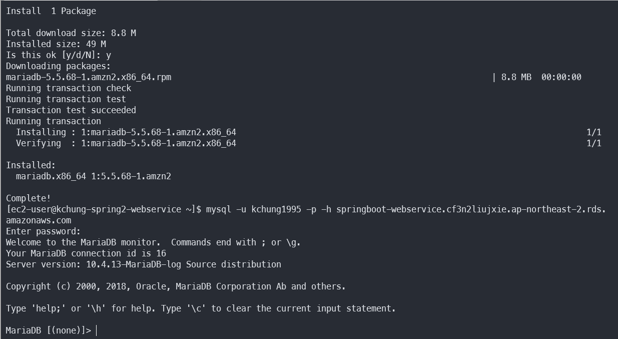 mysql -u kchung1995 -p -h springboot-webservice.cf3n2liujxie.ap-northeast-2.rds.amazonaws.com