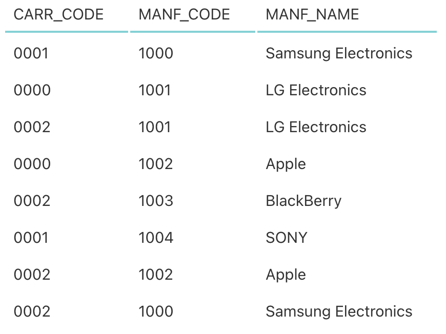 | CARR_CODE | CARR_NAME | MANF_CODE | MANF_NAME |