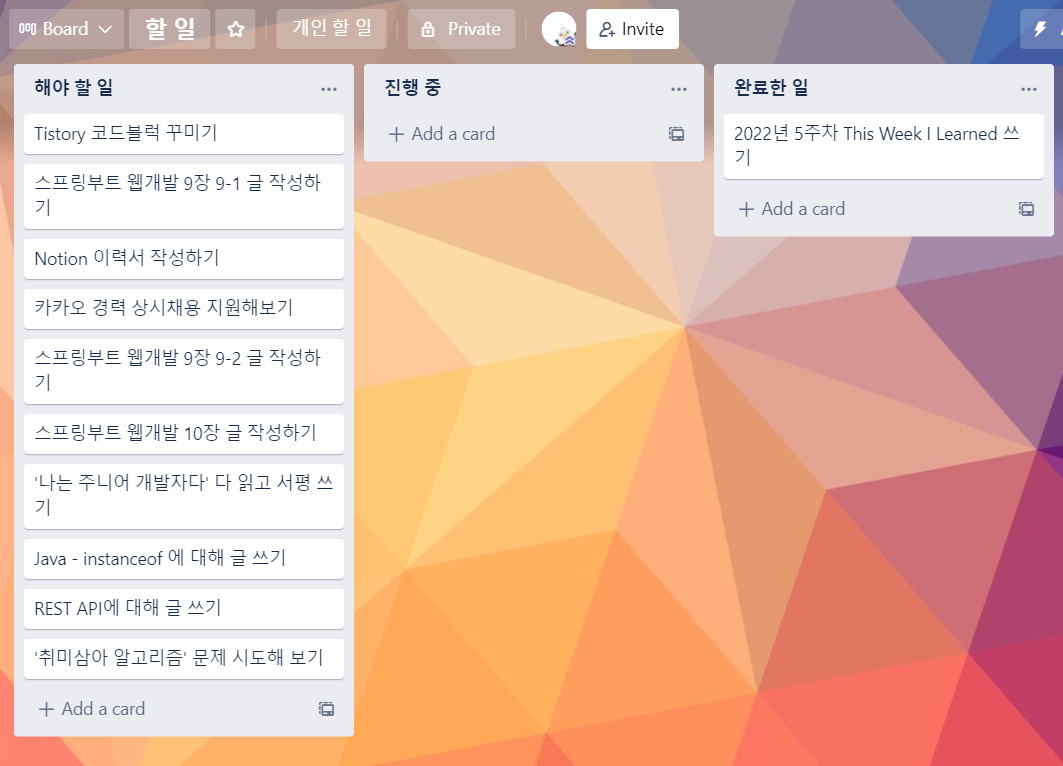그래서 이 글 마지막에 이번 주 목표를 정할 때도 Trello를 활용할 계획이다.