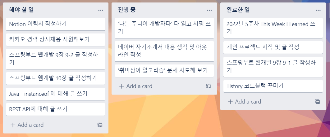 지난 주 부터는 Trello를 이용한 할 일 관리를 시작했다.