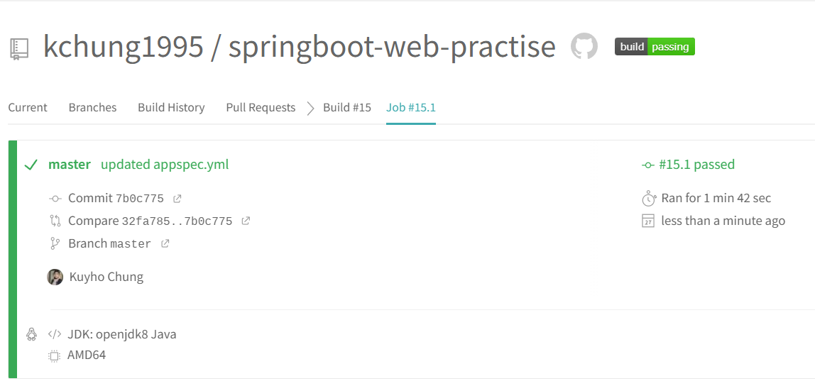 Travis CI를 확인하여 빌드 및 배포가 성공적으로 완료되는지 확인해 보자.
