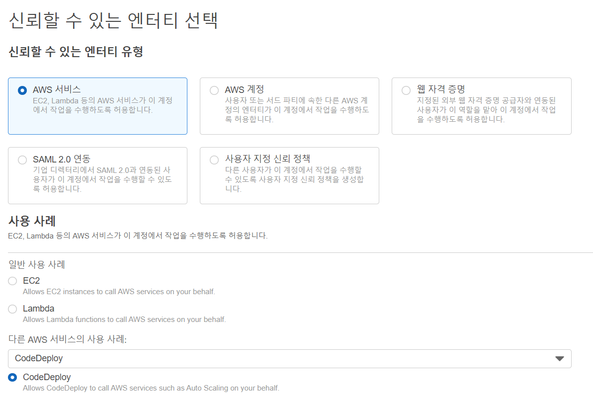 역할은 AWS 내의 서비스에만 할당할 수 있다. EC2, CodeDeploy 등등...