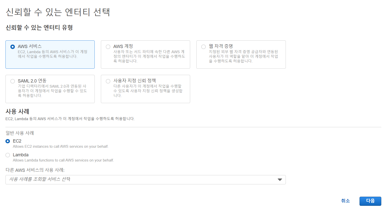 아까와 과정이 유사합니다. 마찬가지로 AWS 서비스이므로, IAM 역할을 선택합니다.
