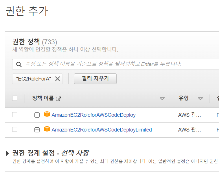 EC2RoleForA를 검색하고, AmazonEC2RoleForAWSCodeDeploy를 선택하자.