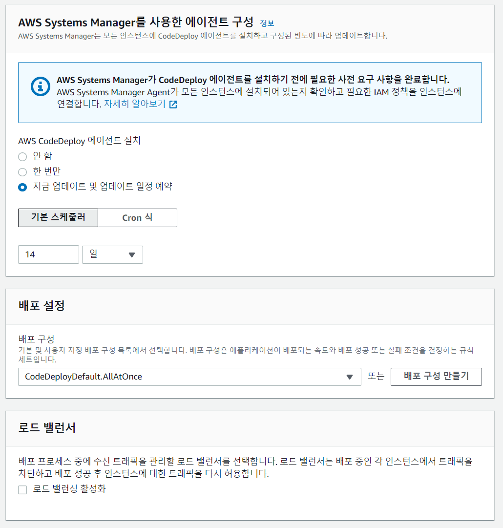 맨 밑에 로드 밸런서는 체크 해제해 주자. 서버가 1대이기 때문에 부하를 분산할 필요가 없다.