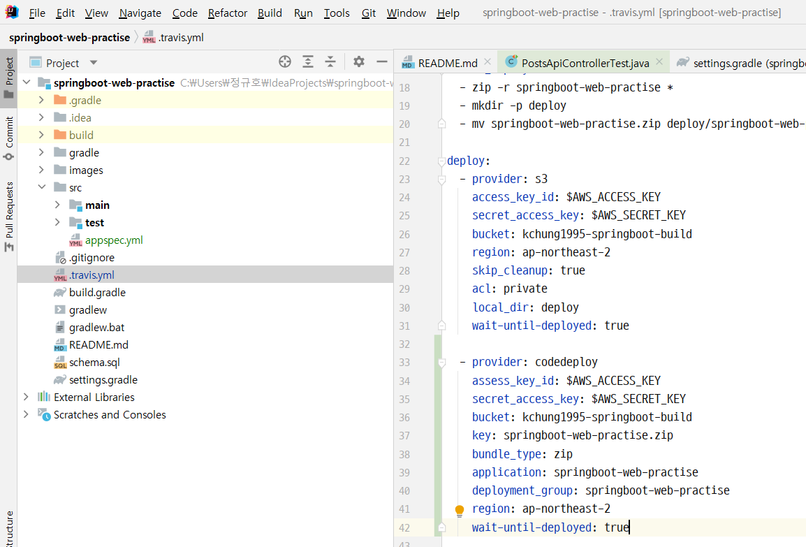 Travis CI의 설정은 .travis.yml 파일을 통해 했던 것처럼, AWS CodeDeploy의 설정은 appspec.yml 파일을 생성해서 진행한다.
