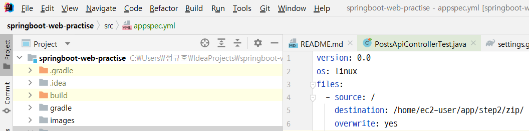 마지막으로 배포 관련 명령을 담당할 appspec.yml을 수정하자.