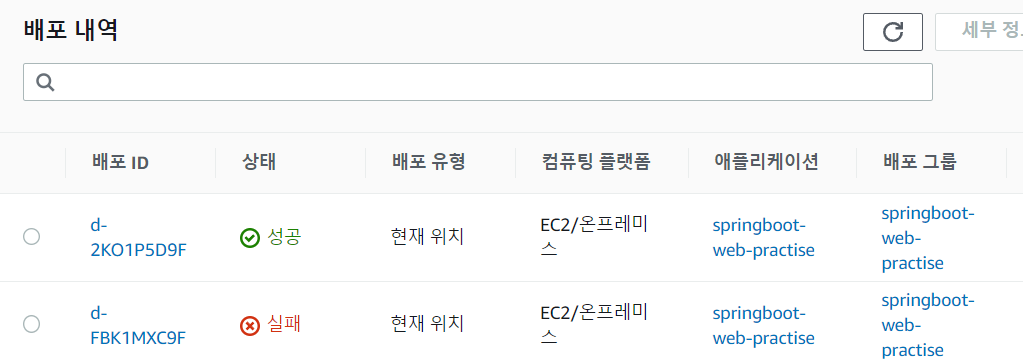 성공한 후 AWS CodeDeploy를 확인해 보면 빌드가 성공한 것을 확인할 수 있다.