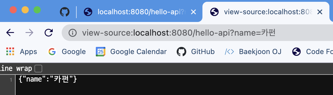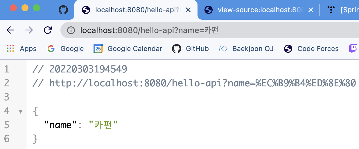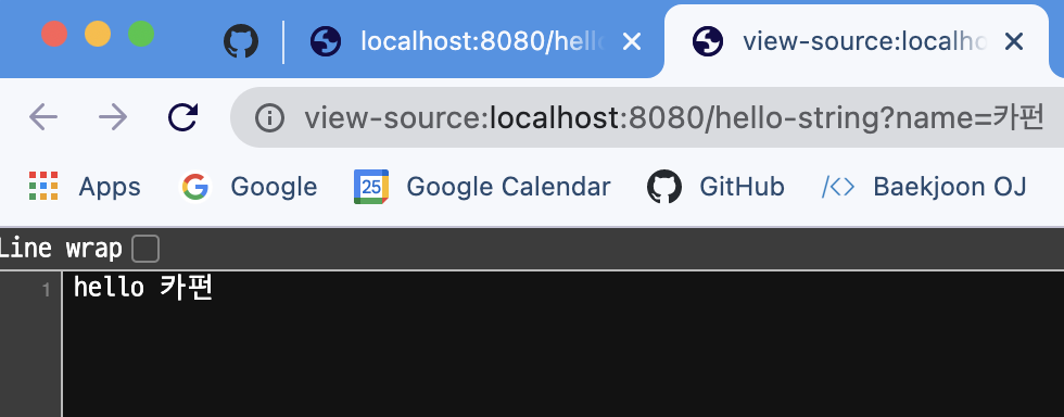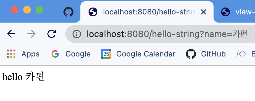 http://localhost:8080/hello-string?name=카펀 이라고 입력해 보겠습니다.