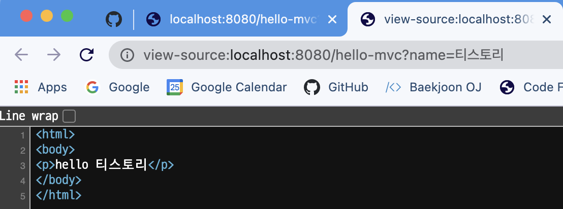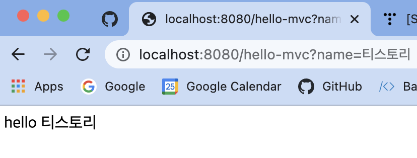 - 클라이언트를 이용해 localhost:8080/hello-mvc?name=티스토리 라는 요청을 보냄