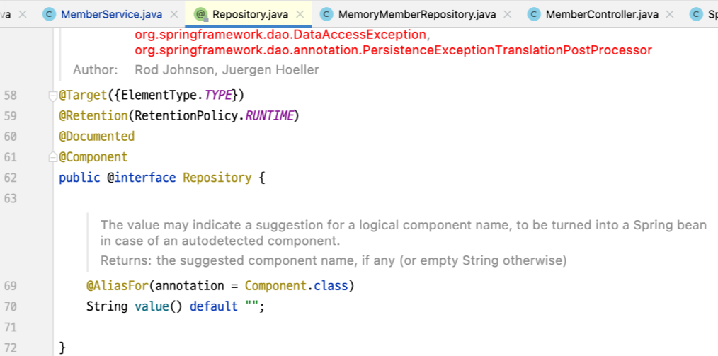 그리고 Repository 역시 마찬가지로 @Repository 어노테이션을 사용하여 Spring Container에 등록시켜 줍니다.