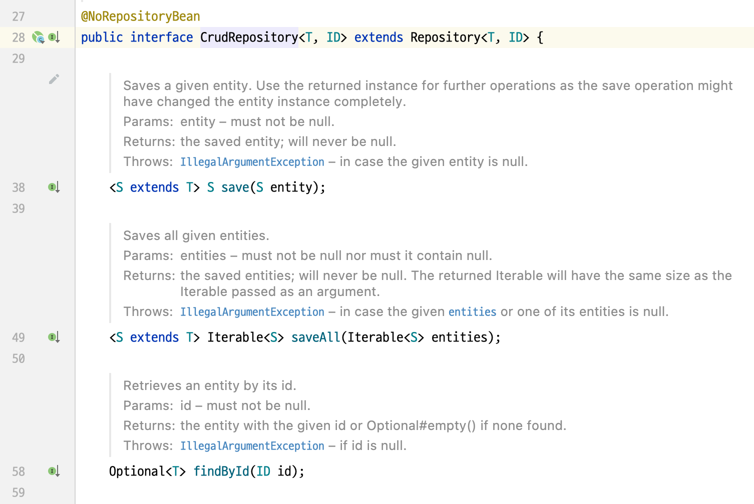 관련 내용은 JpaRepository - PagingAndSortingRepository - CrudRepository의 구현체에 들어가 보면 확인할 수 있습니다.