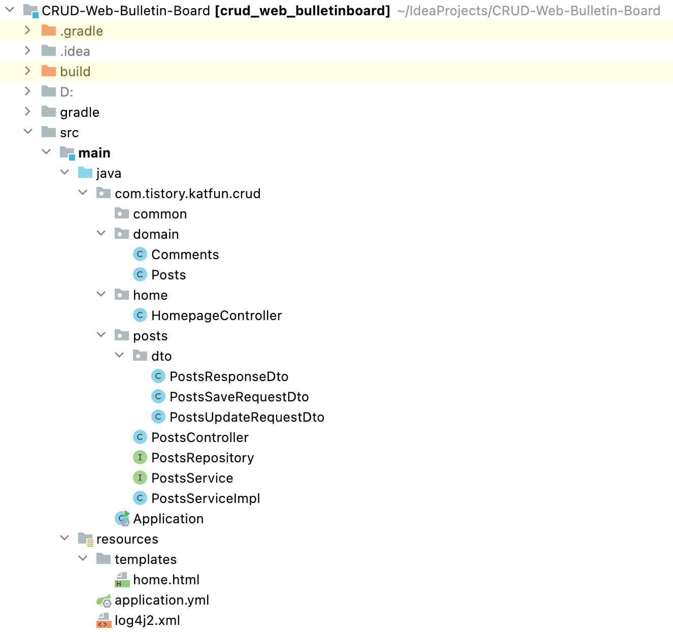 기본적으로 개발하며 생기는 클래스는 src/main/java/com/tistory/katfun/crud 아래에 위치하게 됩니다.