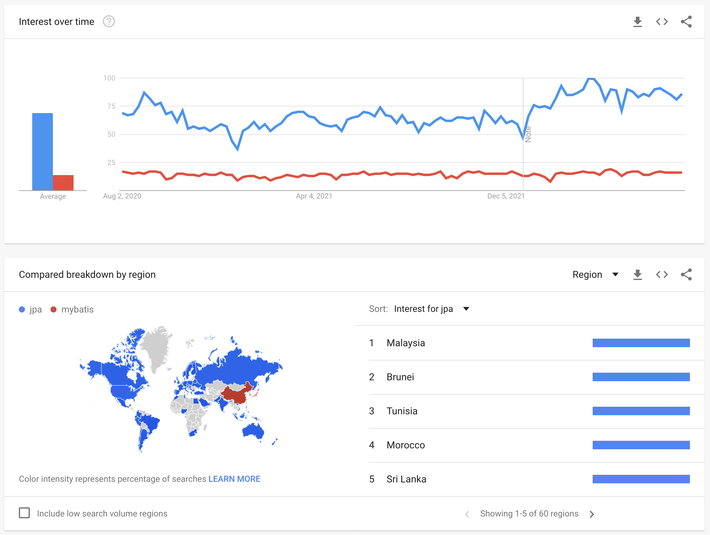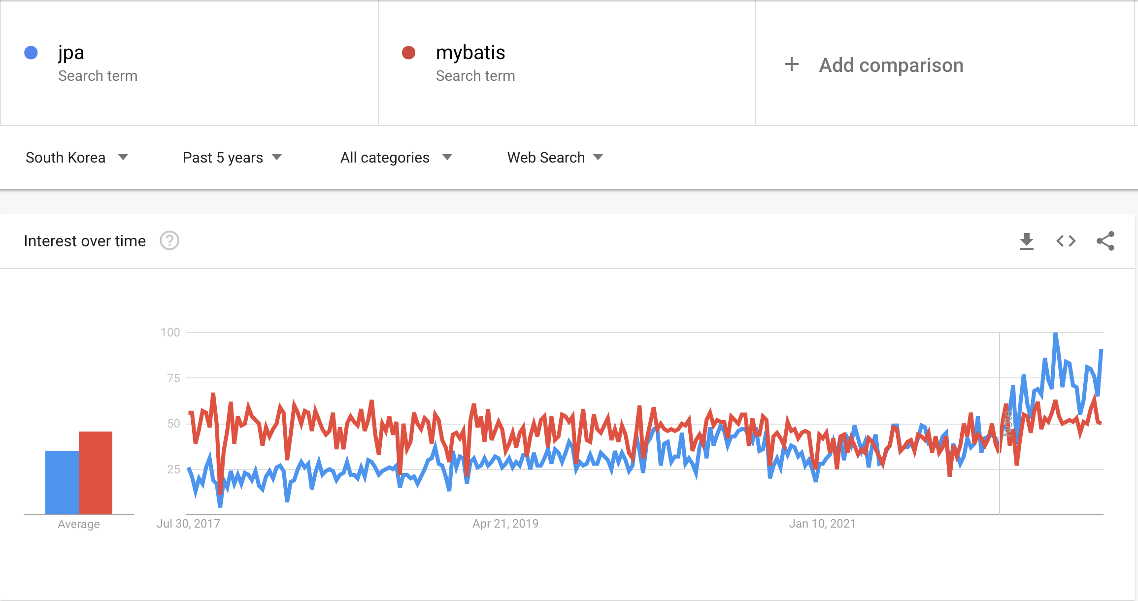 전체적인 관심도를 보면, 꾸준히 MyBatis가 앞서다가, 2021년 초부터는 엎치락뒷치락 하고, 2022년 초부터는 JPA가 점차 우세한 것을 볼 수 있습니다.