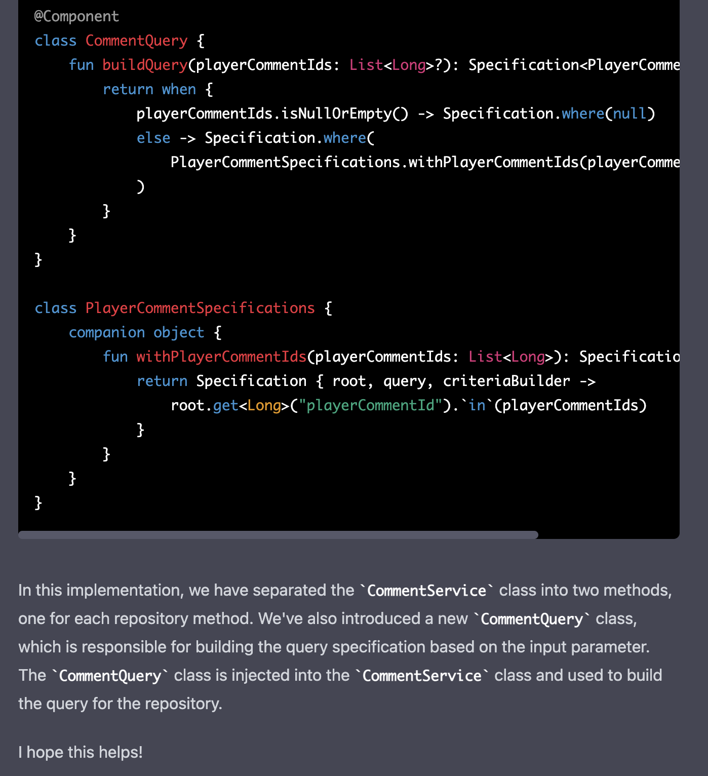 fun buildQuery(playerCommentIds: List<Long>?): Specification<PlayerComments> {