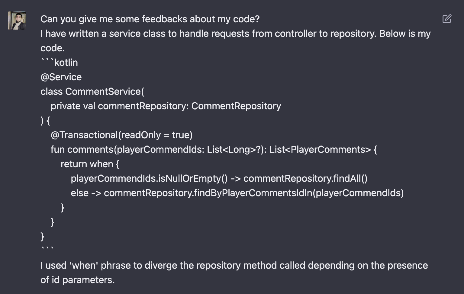- 내 코드를 리뷰해 달라. 컨트롤러의 요청을 레포지토리로 넘기는 코드다.