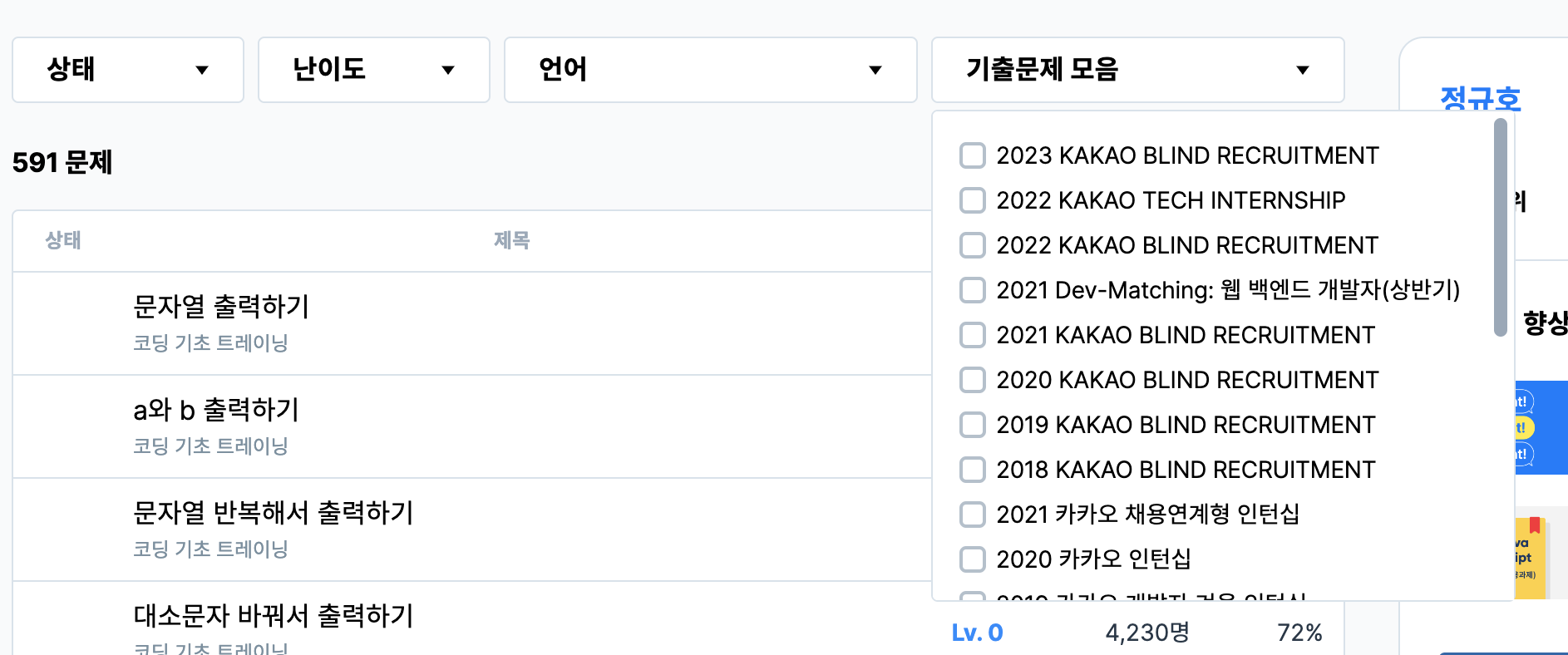 특히, 카카오는 코딩 테스트의 모든 기출 문제를 프로그래머스를 통해 공개하고 있습니다.