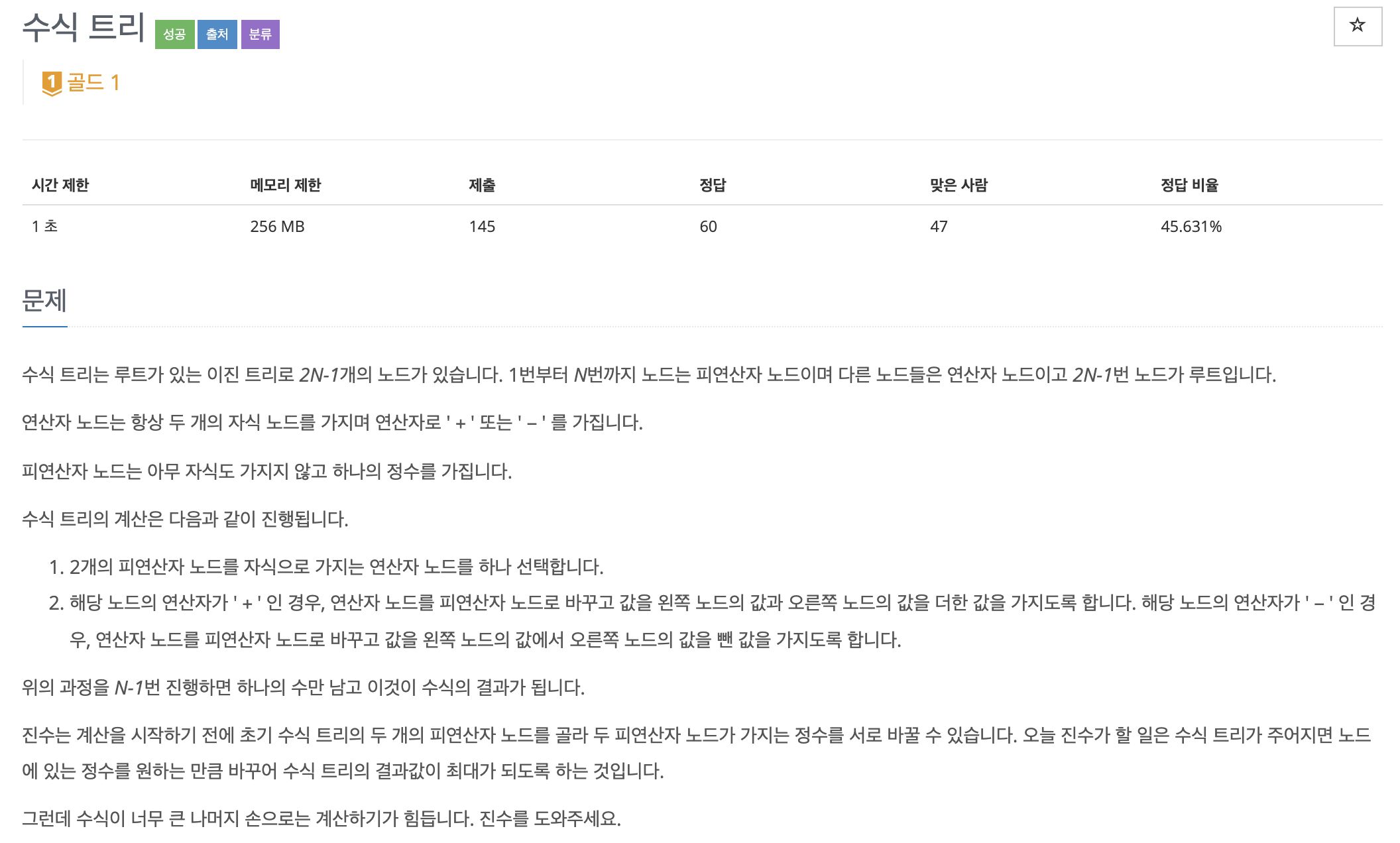 수식 트리는 루트가 있는 이진 트리로 2N-1개의 노드가 있습니다. 1번부터 N번까지 노드는 피연산자 노드이며 다른 노드들은 연산자 노드이고 2N-1번 노드가 루트입니다. 연산자 노드는 항상 두 개