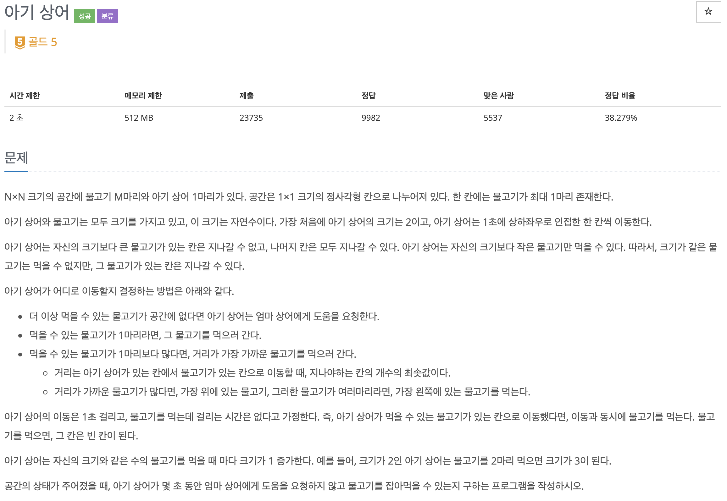 N×N 크기의 공간에 물고기 M마리와 아기 상어 1마리가 있다. 공간은 1×1 크기의 정사각형 칸으로 나누어져 있다. 한 칸에는 물고기가 최대 1마리 존재한다. 아기 상어와 물고기는 모두 크기를 가
