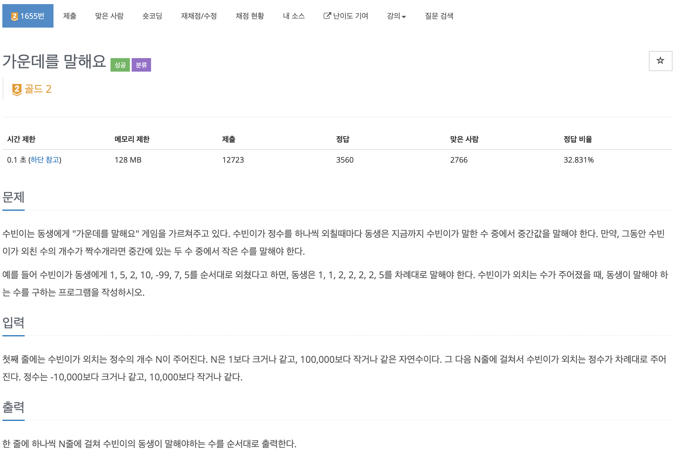 따라서 작은 수들의 배열 중 가장 큰 값이 항상 중간값이 됩니다. 이것을 매번 출력해 줍니다.