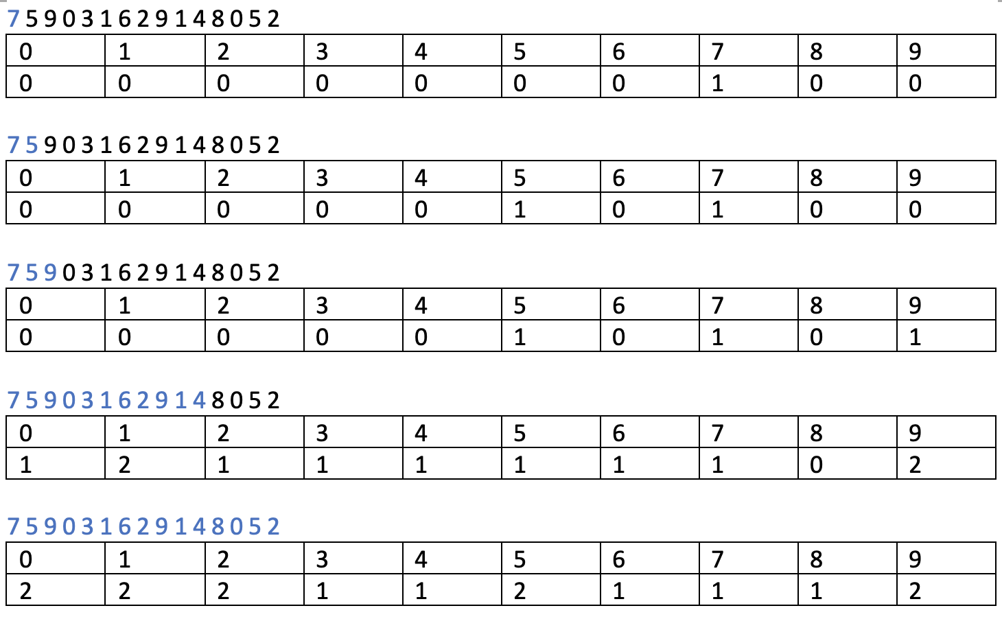 위 예시와 같이 과정을 반복하고 나면, 각 숫자들의 등장 횟수가 기록이 됩니다.