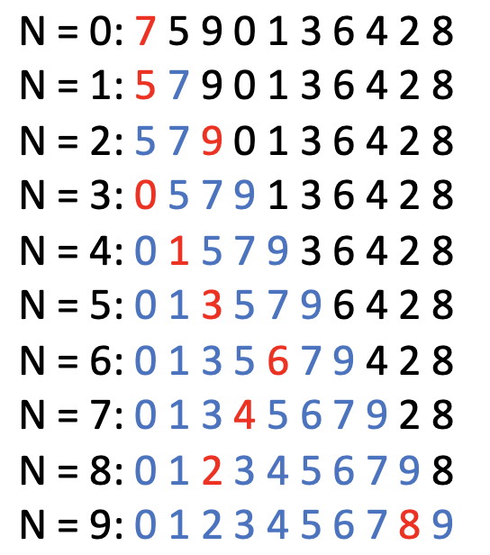 첫 단계는 이미 숫자 1개가 정렬되어 있다고 보고, 이후에 숫자를 적절한 위치에 삽입하는 과정을 N = 1에서 N = 9까지, 총 N-1회 반복하게 됩니다.
