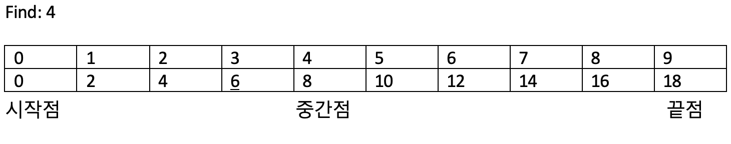 따라서 새로운 시작점은 0번 인덱스, 끝점은 3번 인덱스, 중간점 인덱스는 (3+0) / 2 = 1번 인덱스가 됩니다.