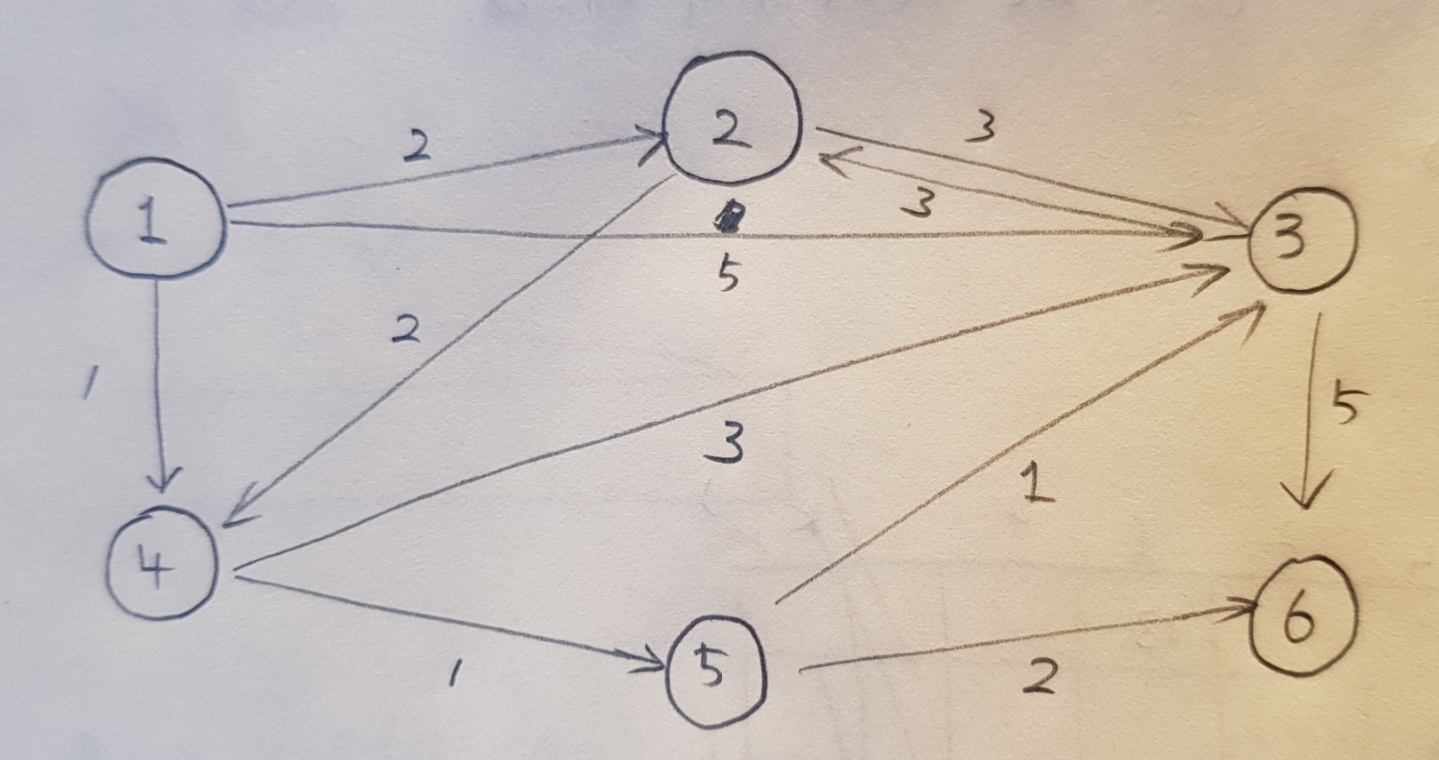 다음과 같은 그래프가 있을 때, 1번 노드에서 다른 모든 노드로 가는 최단 경로를 구하는 문제를 생각해 봅시다. 각 경로에는 방향성이 존재합니다.