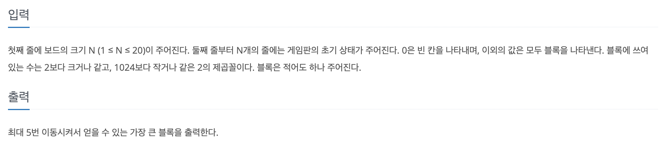 '움직임' 이라고 함은 상하좌우 네 방향으로 숫자들을 이동시키는 것을 말하며, 이 때 이동하는 방향 중 값이 같고 아직 합쳐지지 않은 숫자를 만났다면 두 수를 더합니다.